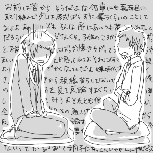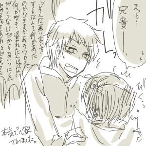 2011.03.05 Sat 14:13:58 幸せすぎて辛い^^^相変わらず幸せ続きで夜も眠れない日々が続く管理人です^^^^^^^ そしてうちのバン夢は悪い意味でのハルマゲドンで本当申し訳ないです;;かなり色んなフィルター掛けまくって酷い状況なの分かってます^q^ そしてお婆ちゃんも可愛いときましたかw 【ローリエさん】 こちらこそ、こんな趣味妄想ダダ漏れなサイトをリンクしてくださり有難うございましたw相互ですよww 意外にもお兄ちゃんネタが気になってくれたようで嬉しいですw フェイが絡むと途端にバンは口調悪くなるし物凄く不機嫌にもなるので私も描いてて楽しかったりしますw 口調悪いお兄ちゃんも良いじゃない、っていう。でもヒロインにはデレデレに甘いと良い^^ バンとフェイのお兄ちゃんコンビは最強ですよ! 何でって、最強の 私 ホ イ ホ イ だからです(ドーン では相互リンク有難うございましたwww 【よつばさん】 はじめまして!いつも楽しく見て下さっているなんて嬉しい限りですw それにリトスカプレイ有難うございます! 変な趣味の産物しか生産してませんが、更新がんばりますw 2011.03.02 Wed 17:02:57 前回の比じゃないかもしれないテンション卒業式があるため色々ごたごたしてましたがそれも終わって改めて怠惰な日々に戻りつつある管理人です。